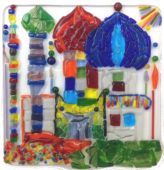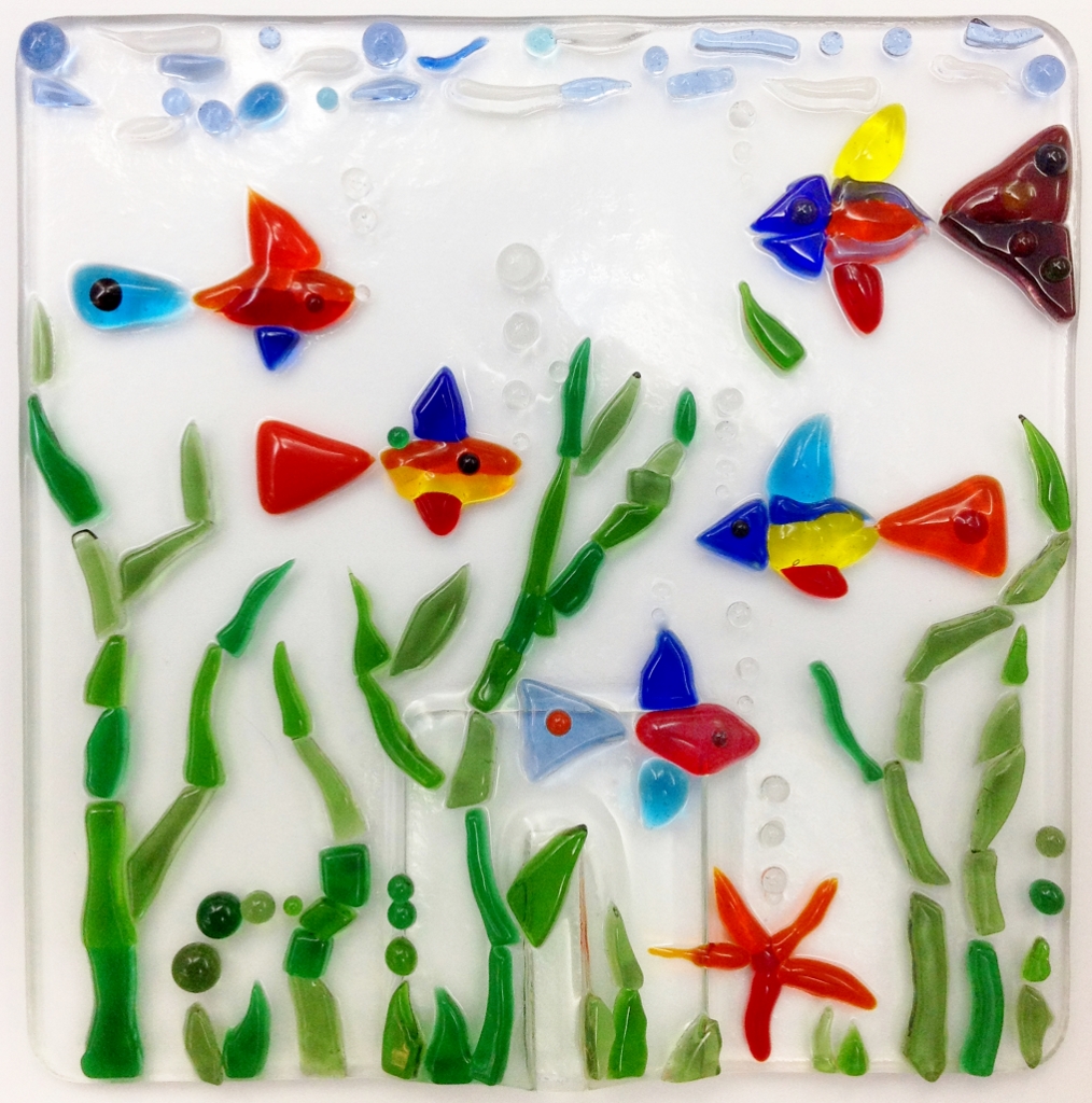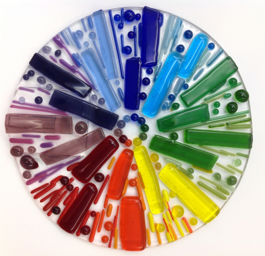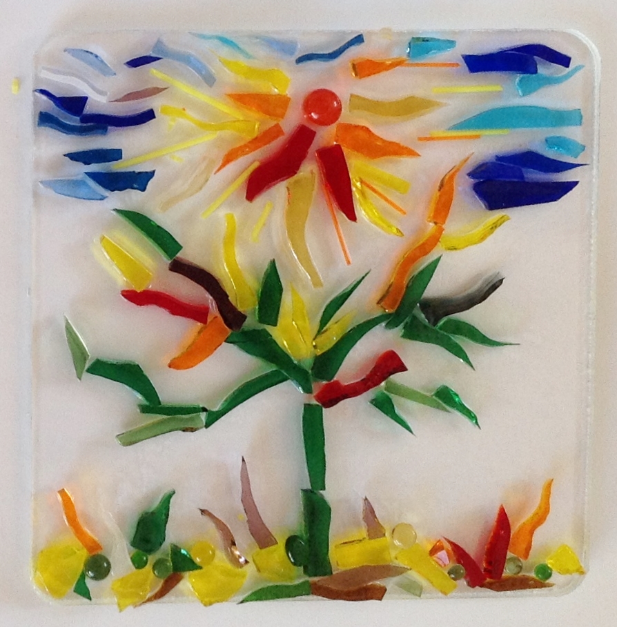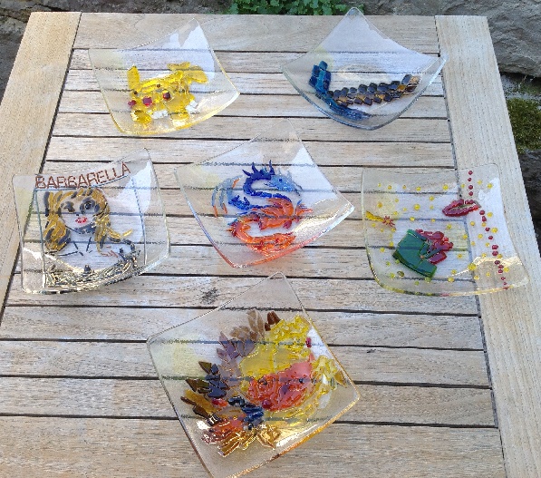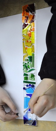 Farbige Glasstücke werden auf dem Trägerglas fixiert. Stück für Stück entstehen so individuelle Bilder oder Glasschalen.